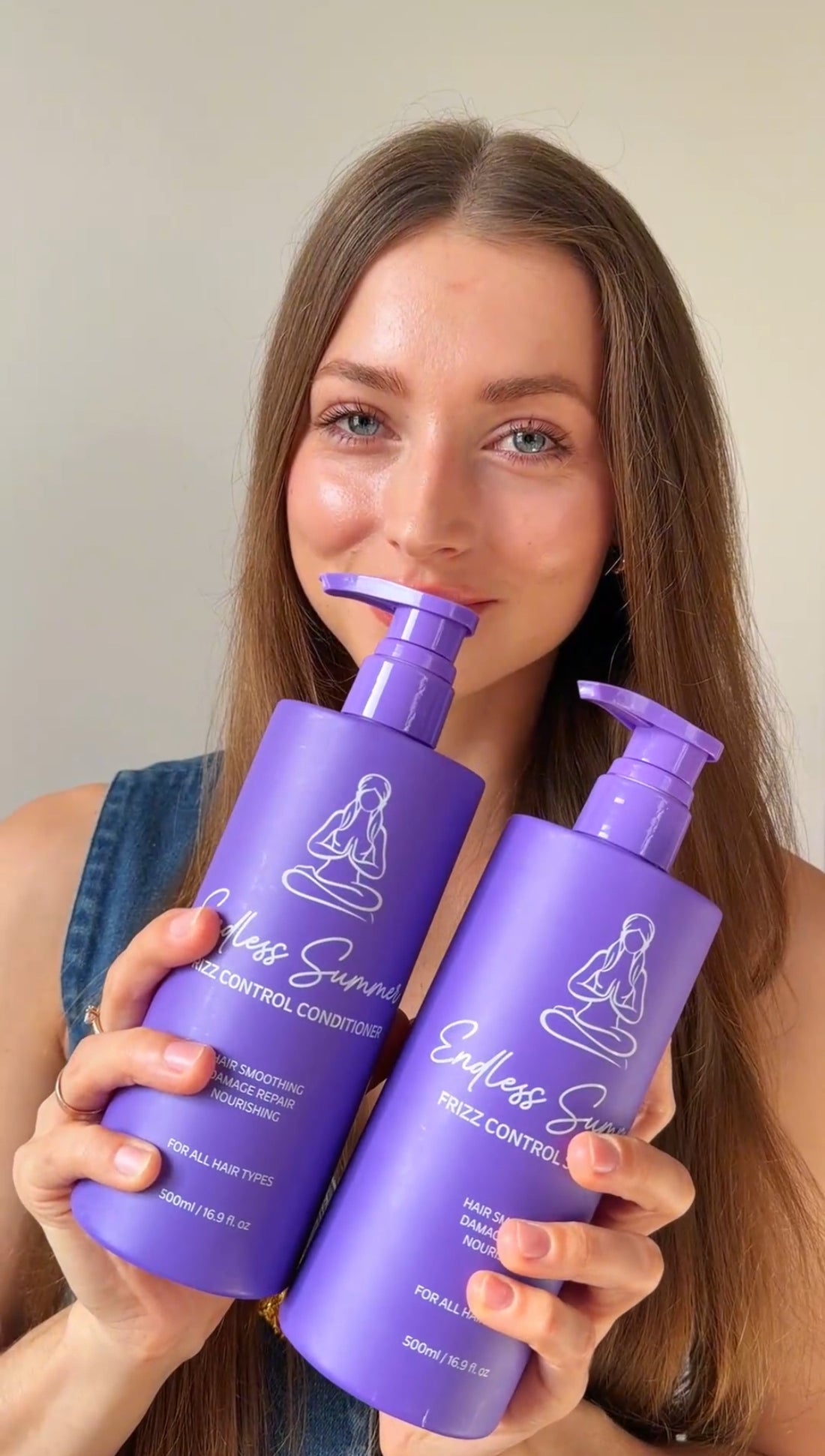 Woman holding a purple bottle against a light purple background